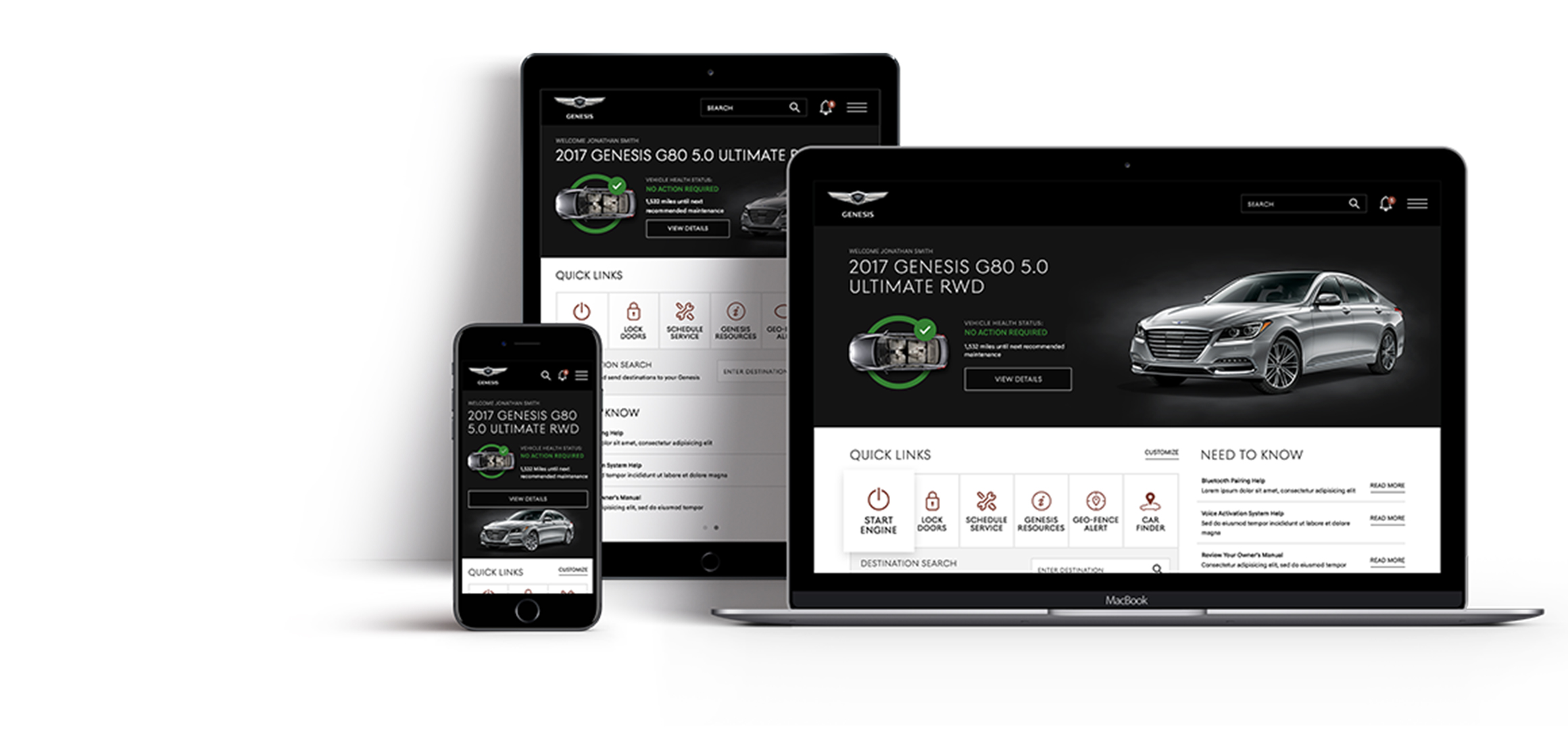 The new MyGenesis design and navigation provides quick and easy access to key areas such as My Account, Vehicle Health, Genesis Connected Services and Genesis Resources. MyGenesis is now accessible from any laptop, tablet or smartphone device.