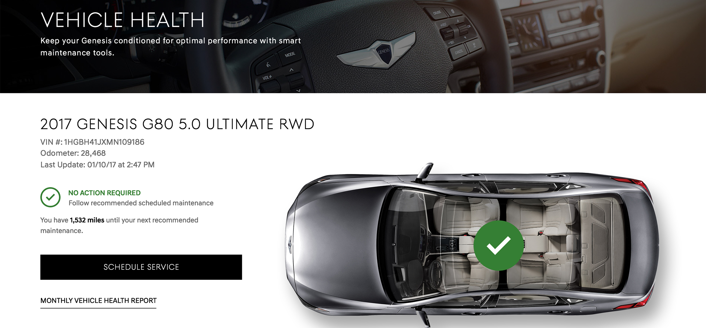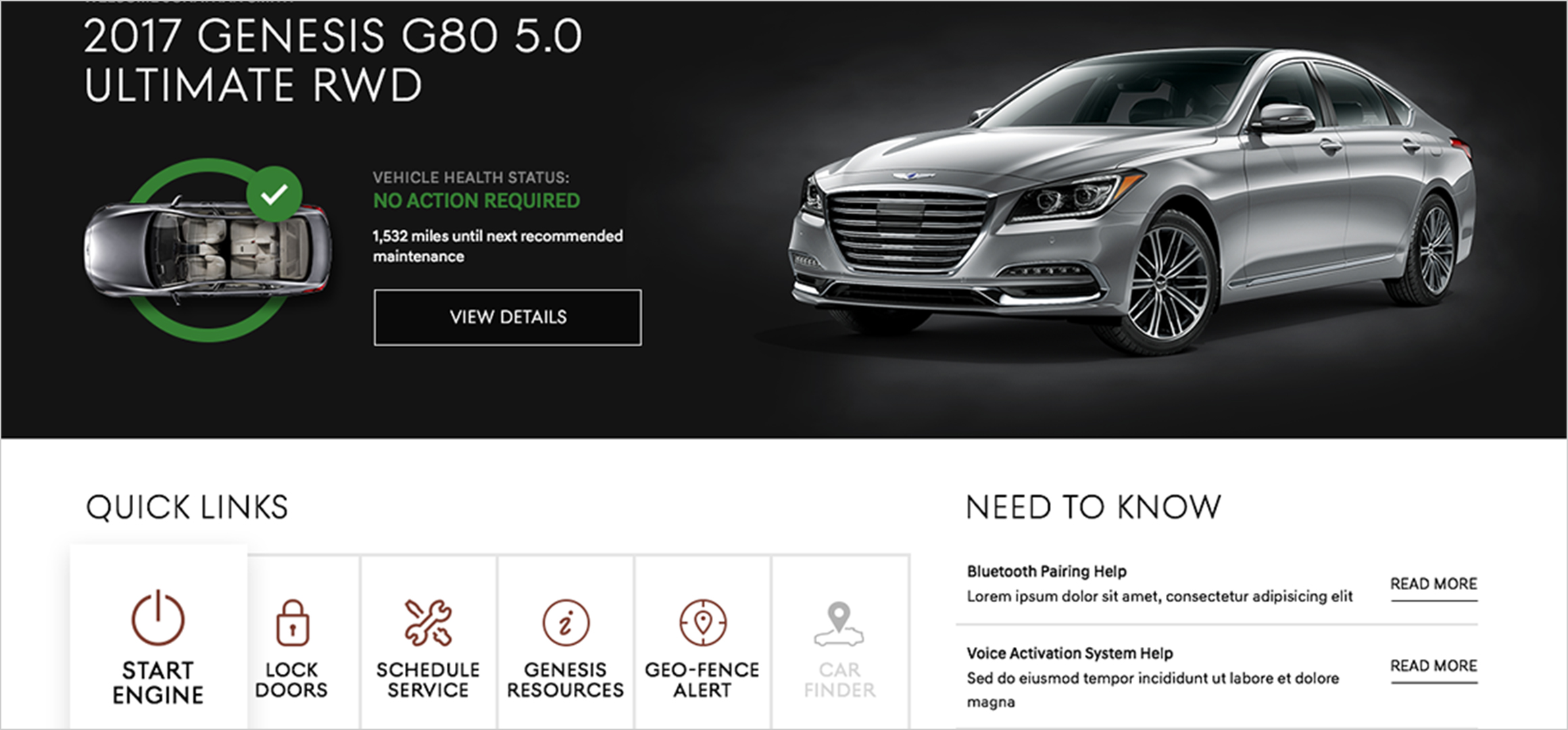 Get a personalized, comprehensive snapshot of your vehicle ownership, including Vehicle Health Status, access to Genesis Connected Services, helpful quick links, and the ability to select your Preferred Service Retailer and more.