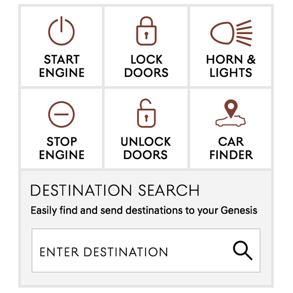 Manage SubscriptionAccess advanced technology Connected Services® features like Destination Search to use your voice to find a location or address or Remote Access to remotely start, lock and unlock your Genesis from your mobile device.